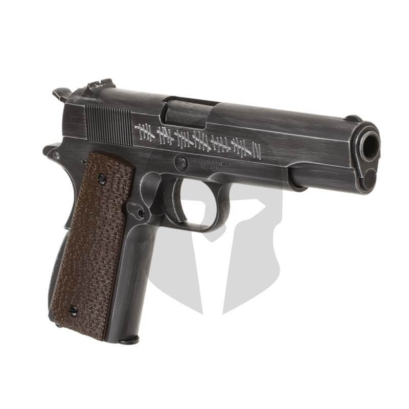 Die Replica besteht fast komplett aus Metall, nur die Griffschalen sind Kunststoff, und besitzt einen interessanten Patina Look und Markers, welche den kampferprobten Einsatz zum Ausdruck bringen sollen. Auf der linken Seite des Schützen befindet sich der Schriftzug “MOΛΩN ΛABE”, welcher eine klassische Hommage an die USGI Seitenwaffe ist und so viel wie “Komm und hol (sie dir)!” bedeutet. US amerikanische Gruppierungen machen damit ihre Entschlossenheit deutlich, nicht aufzugeben. Auf der rechten Seite des Schützen ist eine Strichliste eingraviert. Die Visierung ist 1911-typisch und fest und nicht mit weißen Punkten hinterlegt.