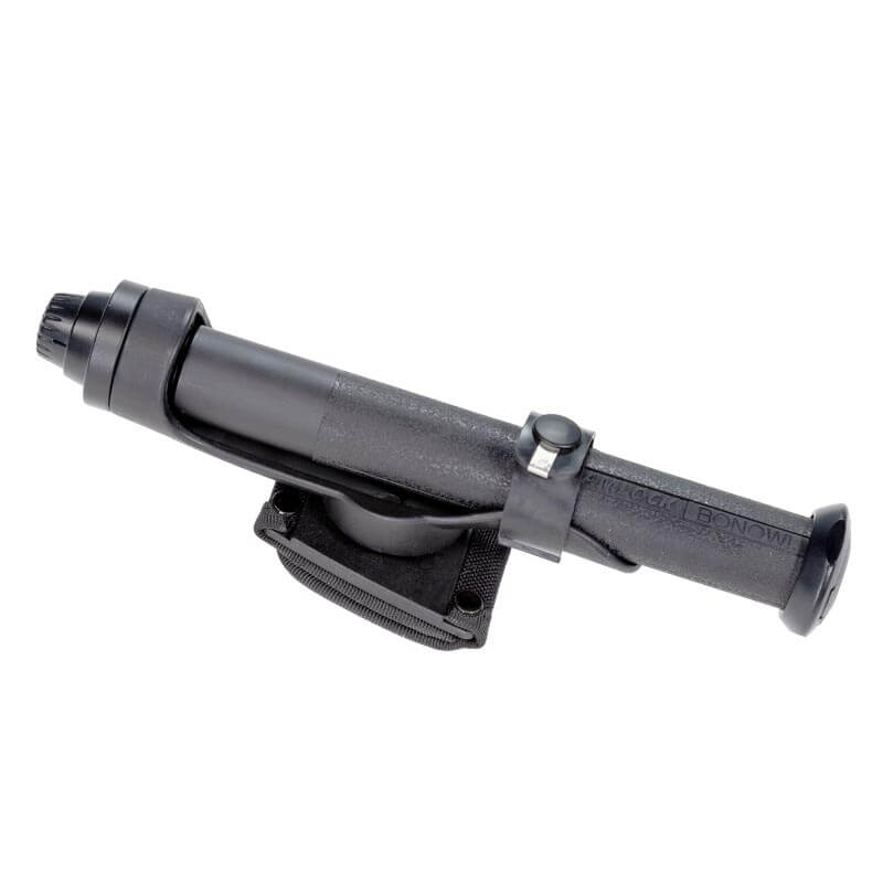 Das H1 von Bonowi ist ein Gürtelholster für den Teleskopschlagstock EKA 21″ (auch mit Defense Adapter). Der Einsatzstock kann dank der Spitzenrastung aus dem Holster heraus direkt expandiert werden, oder auch, wenn der Stock nicht eingerastet ist, ungeöffnet gezogen werden. Am unteren Ende des Holsters befindet sich ein Scheibeneinschlagring, der auch die Möglichkeit gibt, ihn auf den EKA zu montieren. Das Gürtelholster ist passend für 35 – 50 mm breite Gürtel, um 180° drehbar und somit beidseitig tragbar.