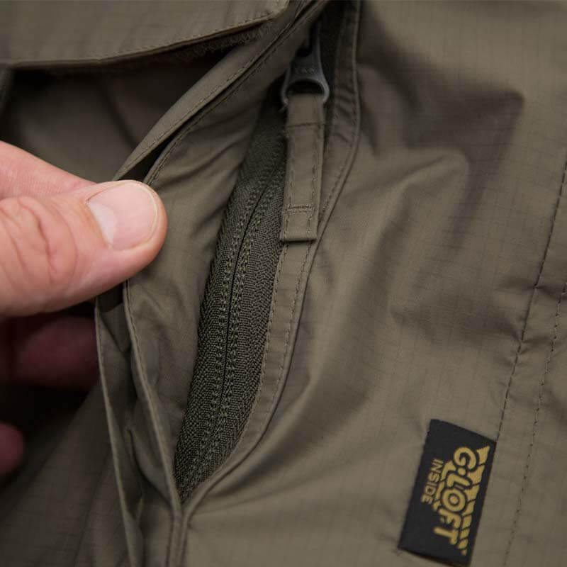 - sechs Fronttaschen (2x Brusttaschen mit Reißverschluss, 2x Seitentaschen mit Thermofleece-Futter und Reißverschluss, 2x aufgesetzte Taschen mit Patte und Klett)