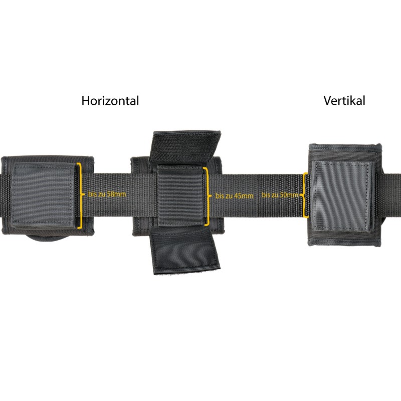 - horizontale Trageweise mittels Klettschlaufe für bis zu 58 mm breite Gürtel oder innerer Schlaufe für bis zu 45 mm breite Gürtel