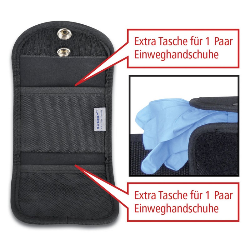 - zwei getrennte Fächer für je 1 Paar Einweghandschuhe + 1 Paar Einsatzhandschuhe