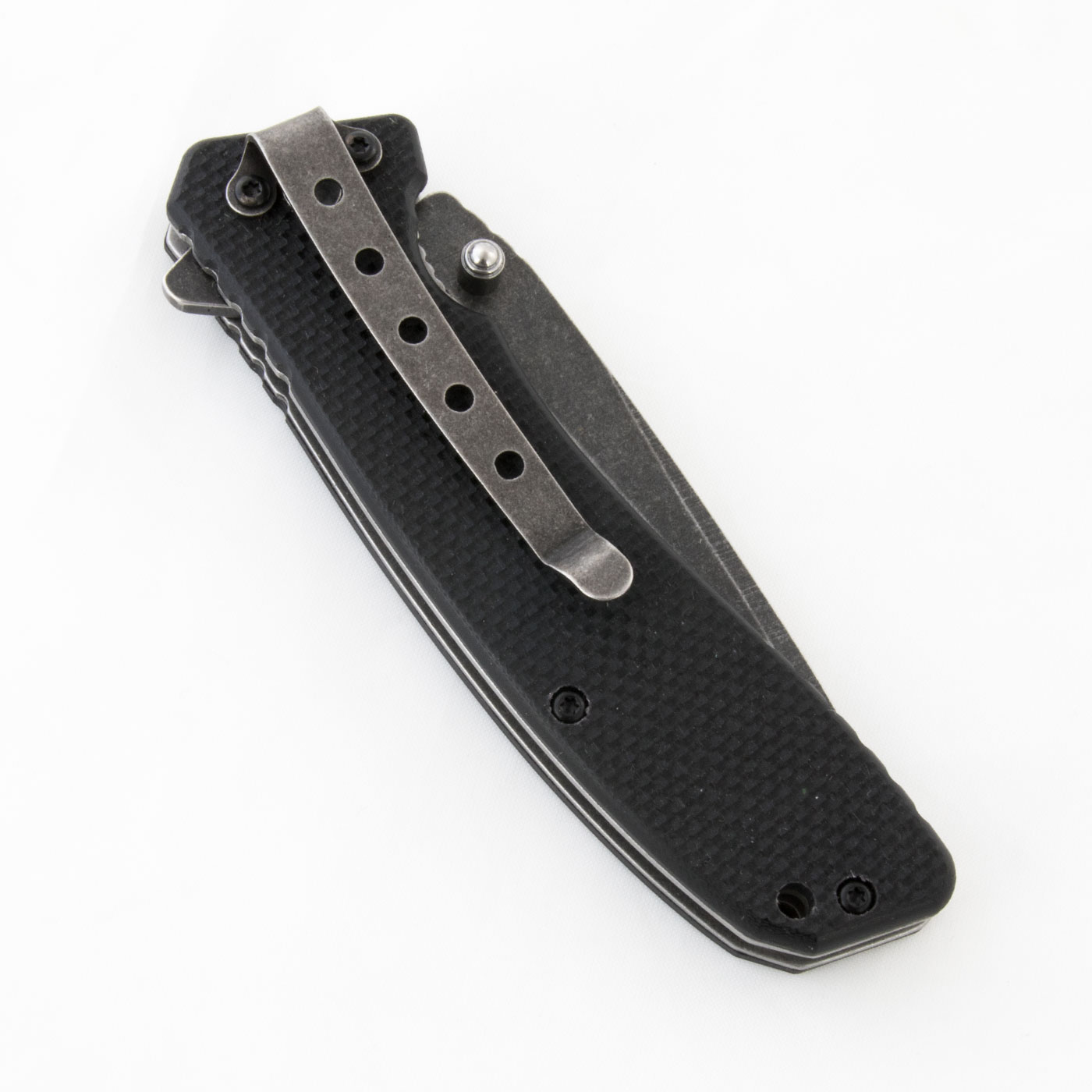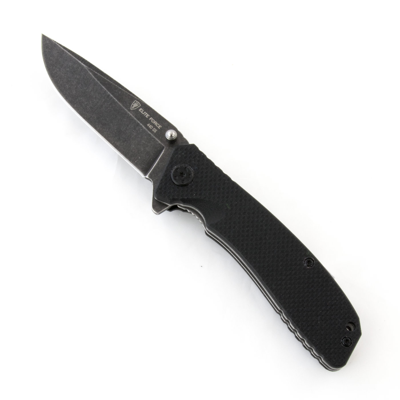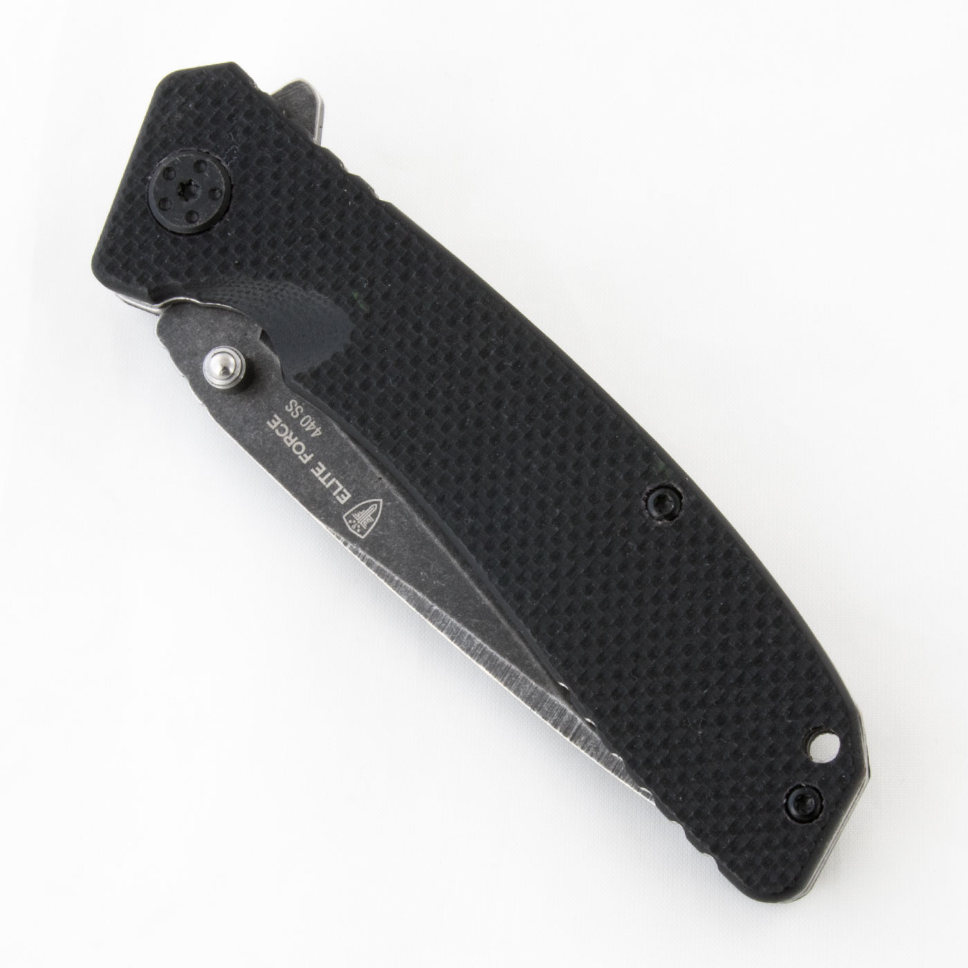 Das Elite Force EF 133 ist ein Folder im Vintage-Look – eine schwarze Spearpoint-Klinge mit Stonewashed-Finish, die sich per Flipper oder beidseitigem Klingenheber öffnen lässt. Ein Liner-Lock verriegelt sie dann. Die Griffschalen aus schwarzem G10 sind verschraubt und der rechtsseitige Clip kann entfernt werden.