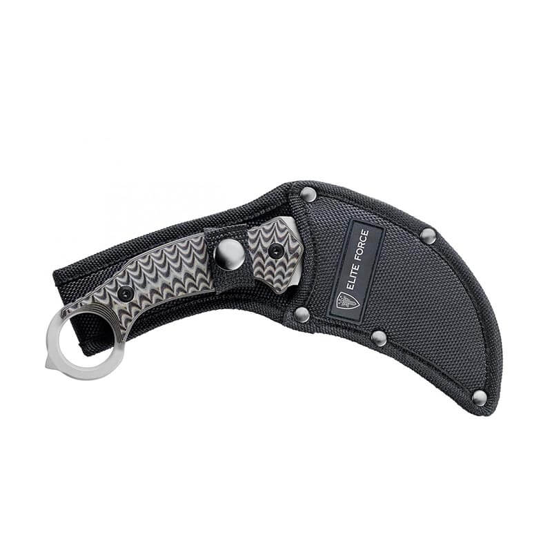 Mit seiner ausgefallenen klauenförmigen Karambit-Form und dem 2-farbigen G10-Griff fällt dieses Messer auf. Wie die meisten Karambits kannst du das Elite Force EF 715 auf zwei Arten führen: Beim konventionellen Griff steckst du den kleinen Finger durch den Ring und legst den Daumen auf den Griffrücken. Beim Reverse-Grip greifst du mit dem Zeigefinger durch den Ring und umschließt mit den anderen Fingern den Griff. Das Satin-Finish der Klinge findet sich auch auf dem durchgehenden Erl wieder. In der mitgelieferten Nylon-Scheide trägst du das Messer sicher.