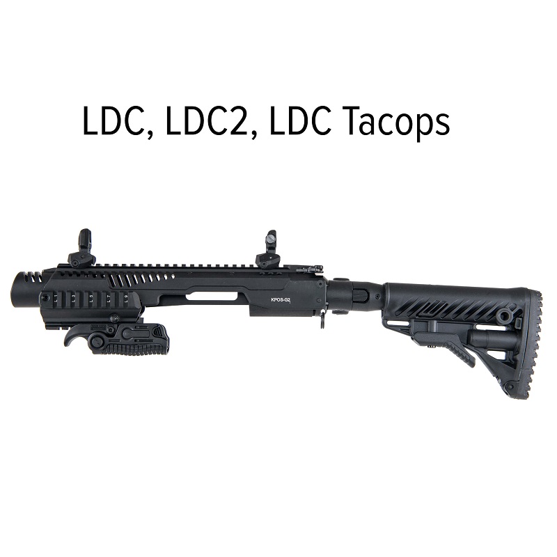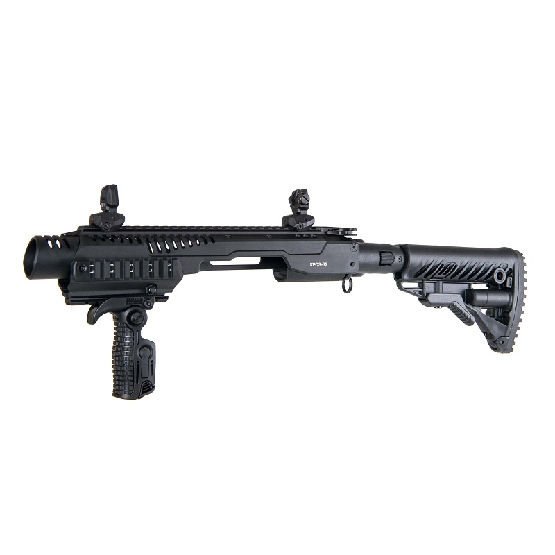 Der KPOS G2 besteht aus einem hart eloxierten und formstabilen Aluminium-Rahmen mit eingebautem und beidhändig bedienbaren Durchlade-Mechanismus im AR15-Stil. Das Kit besitzt sowohl am oberen Teil eine 1913 MIL-STD Picatinny-Schiene in voller Länge als auch Seitenschienen und eine untere Schiene, die eine ultimative Stabilität und Präzision für die Montage von Optiken und Visieren ermöglichen. Außerdem erhielt der KPOS einen “One Button”-Entriegelungskopf, der die Benutzerfreundlichkeit erhöht und eine schnelle und einfache Installation der Waffe im KPOS G2C ermöglicht ohne dass spezielle Werkzeuge oder Änderungen an der Pistole erforderlich sind. Der vertikale Vordergriff lässt sich in horizontaler Position falten und besitzt einen ausziehbaren Abzugsgriff (Trigger-Sicherung). Der Schaft ist ebenfalls faltbar und mit einem Gummi-Pad ausgestattet.