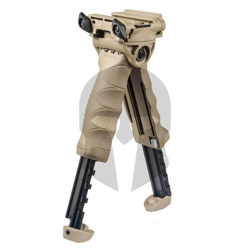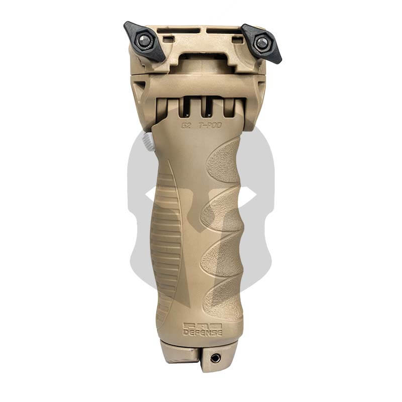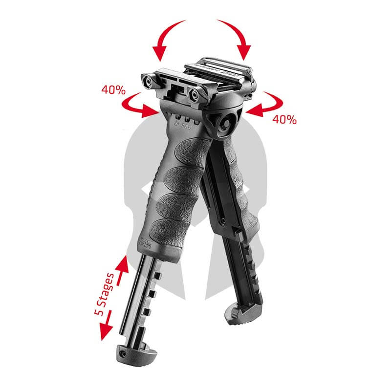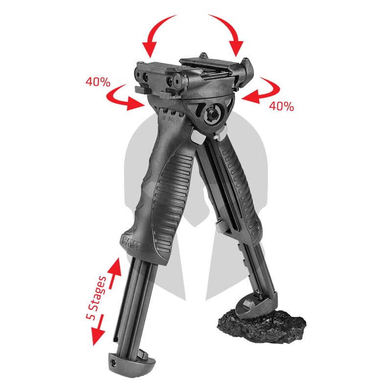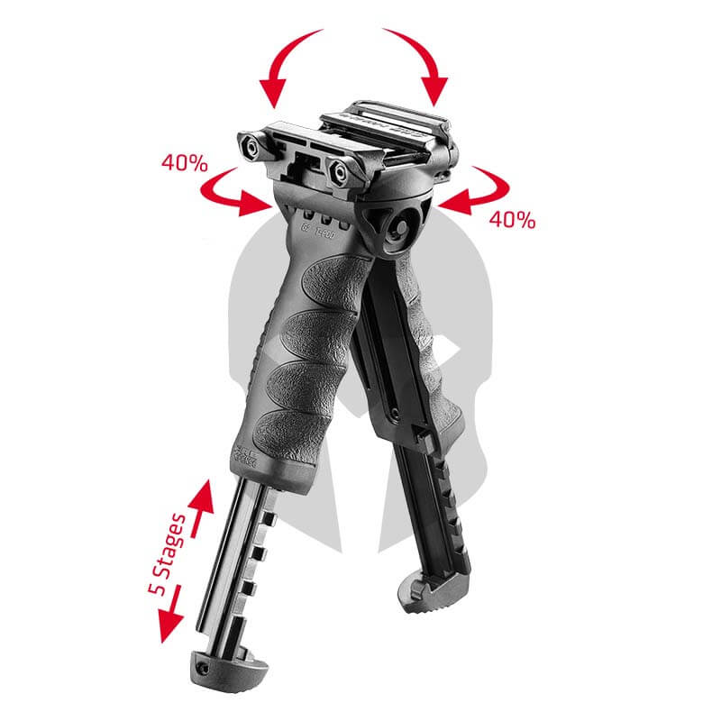 Der FAB Defense T-Pod G2 macht den taktischen Vordergriff per Knopfdruck zu einem voll funktionsfähigen, drehbaren Zweibeiner. Die Länge der Schenkel sind in 5 Stufen verstellbar, wobei jedes Bein in 11 mm Schritten verstellbar ist. Die Montage erfolgt mittels Schnellverschluss-Mechanismus, wodurch er sich leicht an jede untere Picatinny-Schiene anbringen lässt. Dank einer in den Kopf des T-Pod G2 integrierten Adapterplatte verfügt er über einen einzigartigen Dreh- und Kippmechanismus, so dass verschiedenste taktische Positionierungen der Waffe ermöglicht werden können.
