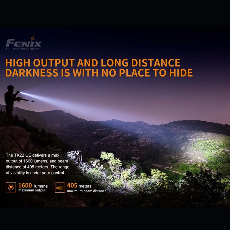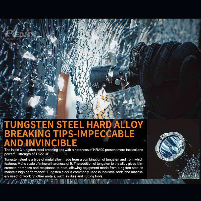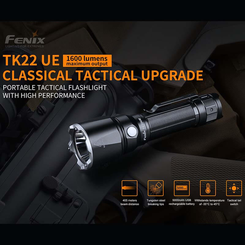 Die Fenix TK22 UR unterstützt das Design-Konzept der TK-Serie hinsichtlich Zuverlässigkeit, Robustheit und Leistung. Der neue Lampenkopf ist bei der TK22 UE taktischer und dank einer Edelstahl-Lünette mit 3 Spitzen Wolfram-Stahl-Glasbrechern auch leistungsstärker. Angetrieben durch einen im Lieferumfang enthaltenen und mittels beiliegendem USB-Kabel wiederaufladbaren 21700 Li-Ion Akku strahlt das Licht mit einer maximalen Leistung von 1.600 lm bis zu 405 m weit. Für eine einfache und schnelle Bedienung steuern 2 Schalter die 4 Helligkeitsstufen und das Stroboskop. Zu den zusätzlichen Funktionen gehören u.a. eine digitale Regelung für weitgehend gleichbleibende Helligkeit, ein Überhitzungs- und Verpolungs-Schutz sowie eine Warnung bei geringer Spannung – also alles für den taktischen Einsatz, industrielle Verwendung oder den privaten Gebrauch.