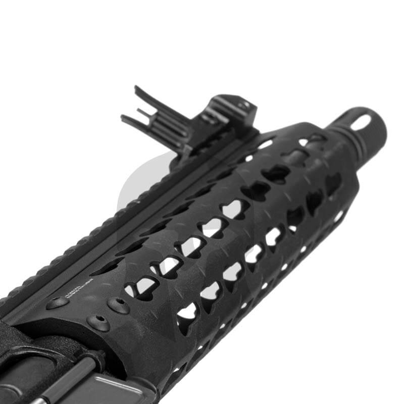 Ausgestattet ist sie mit einer 37 cm langen 22 mm Montageschiene für Optiken, auf welcher Kimme und Korn (beide abschraubbar) bereits montiert sind. Das Highlight: G&G hat bei dieser Version ein Keymod System aus Aluminium verbaut, auf welcher sich problemlos sämtliches Keymod-Zubehör montieren lässt.