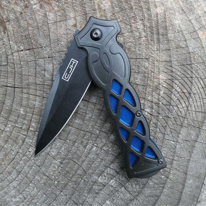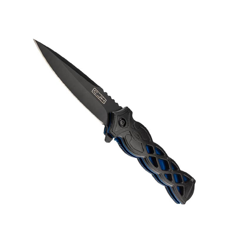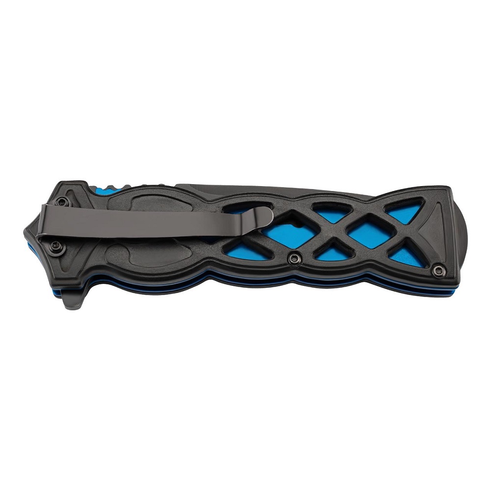 Dieses Einhandmesser aus der CJH Serie von Herbertz ist mit einer schwarz beschichteten Spear Point Klinge aus rostfreiem AISI 420 Stahl ausgestattet. Über einen Flipper wird die Klinge mit nur einer Hand schnell in Arbeitsposition gebracht und über einen Liner Lock Mechanismus sicher arretiert. Schwarze Heftschalen aus ABS Kunststoff in Form eines keltischen Knotens geben den Blick auf die darunter liegenden blau gefärbten Platinen frei. Ein schwarzer Tip Down Gürtelclip rundet die Ausstattung ab.