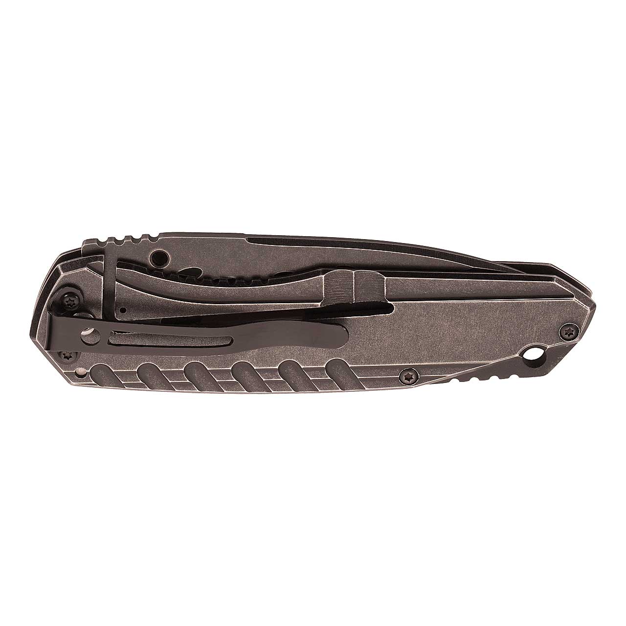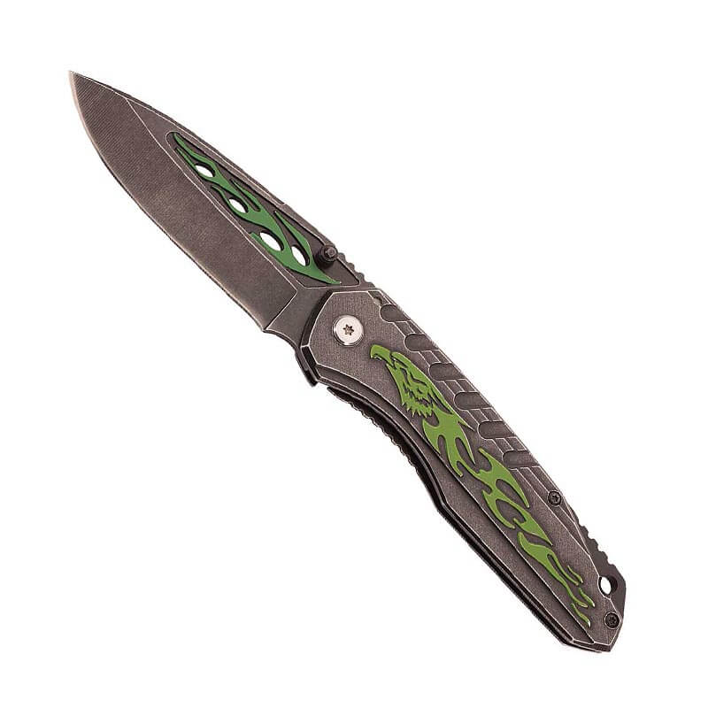 Dieses handliche Herbertz Einhandmesser mit Adler-Motiv ist mit einer Klinge aus rostfreiem Stahl AISI 420 ausgestattet. Sowohl die Klinge als auch die Edelstahl-Griffschalen sind mit einer grauen Titanbeschichtung versehen und weisen ein grünes Muster auf. Abgerundet wird dieses Messer mit beidseitigen Daumenpins sowie einem Gürtelclip aus Edelstahl.