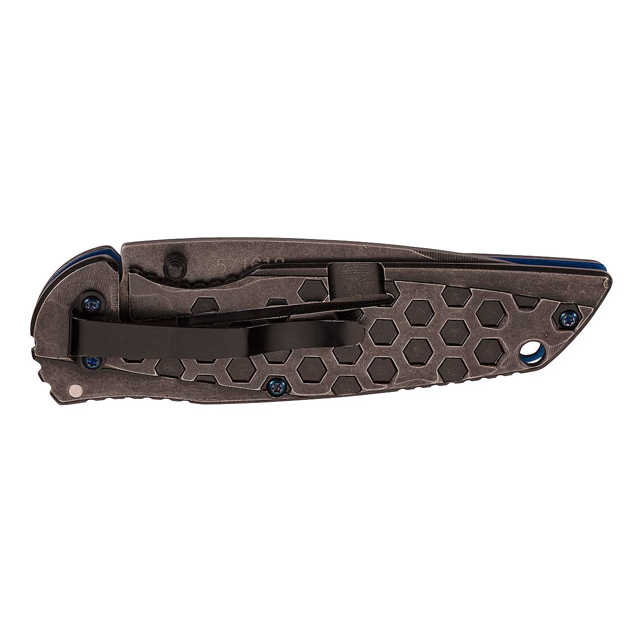 Dieses robuste Einhandmesser aus dem Hause Herbertz weist dank eines Griffs aus Edelstahl in einem Stonewashed-Finish ein beachtliches Gewicht aus. Passend dazu ist die Klinge aus rostfreiem Stahl 420 im gleichen Stil gehalten. Sechseck-Aussparungen auf der Griffoberseite, die einen Einblick auf die darunterliegende blaue Platine gewähren, geben diesem Modell ein futuristisches Design. Auf der Unterseite wurde auf eine zusätzliche Platine verzichtet, so dass die geöffnete Klinge von einem in der Schale integrierten Framelock fixiert wird. Incl. Gürtelclip.