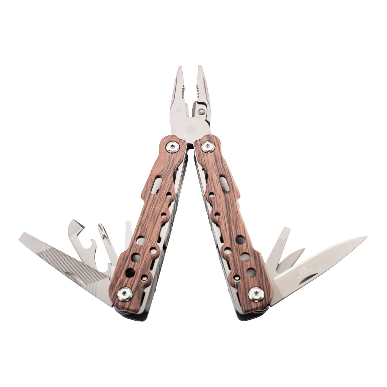 Bei diesem Herbertz Multitool in attraktiver Holzoptik sind alle Werkzeuge mit einer Titanbeschichtung versehen. Zu den Werkzeugen gehören: federunterstützte Spitzzange mit Kabelschneider, Messerklinge, Klinge mit Sägezahnung, Ahle, Schlitz-Schraubendreher groß und klein, Philips-Schraubendreher, Dosenöffner mit Kapselheber und Abisloierkerbe, Feile. Alle Werkzeuge, die in den Griffelementen untergebracht sind, werden in geöffnetem Zustand von einem Back Lock Mechanismus arretiert. Zum Lieferumfang gehört ein schwarzes Nylon-Etui mit Gürtelschlaufe.
