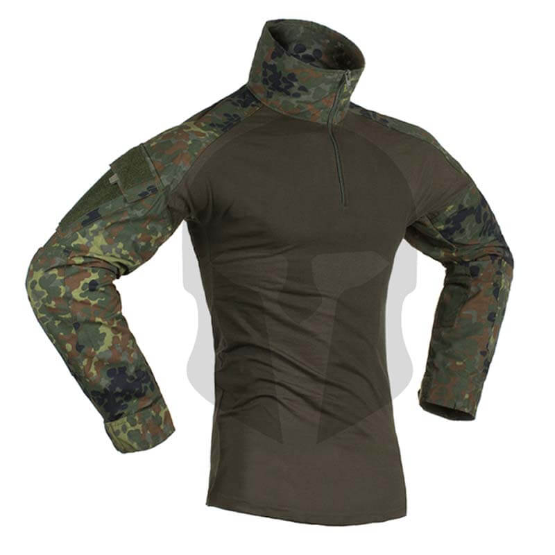 Das Combat Shirt flecktarn ist ein leichtes und angenehm zu tragendes Tactical Shirt aus der neuen Serie von Invader Gear. Der moderne Schnitt sorgt für eine sehr gute Bewegungsfreiheit. Getragen wird es insbesondere unter einem Plattenträger, um Druckstellen zu vermeiden und um einen idealen Transport von Feuchtigkeit von der Haut weg zu gewährleisten. Beide Ärmel sind mit schräg aufgenähten Taschen am Oberarm sowie Klett für ID-Patches und der linke Ärmel zusätzlich mit einem Einschub für Stifte o.ä. ausgestattet. Die Ellbogen sind mit einer zweiten Stoffschicht verstärkt, welche gleichzeitig als Einschubfach für Ellbogenschoner dient.