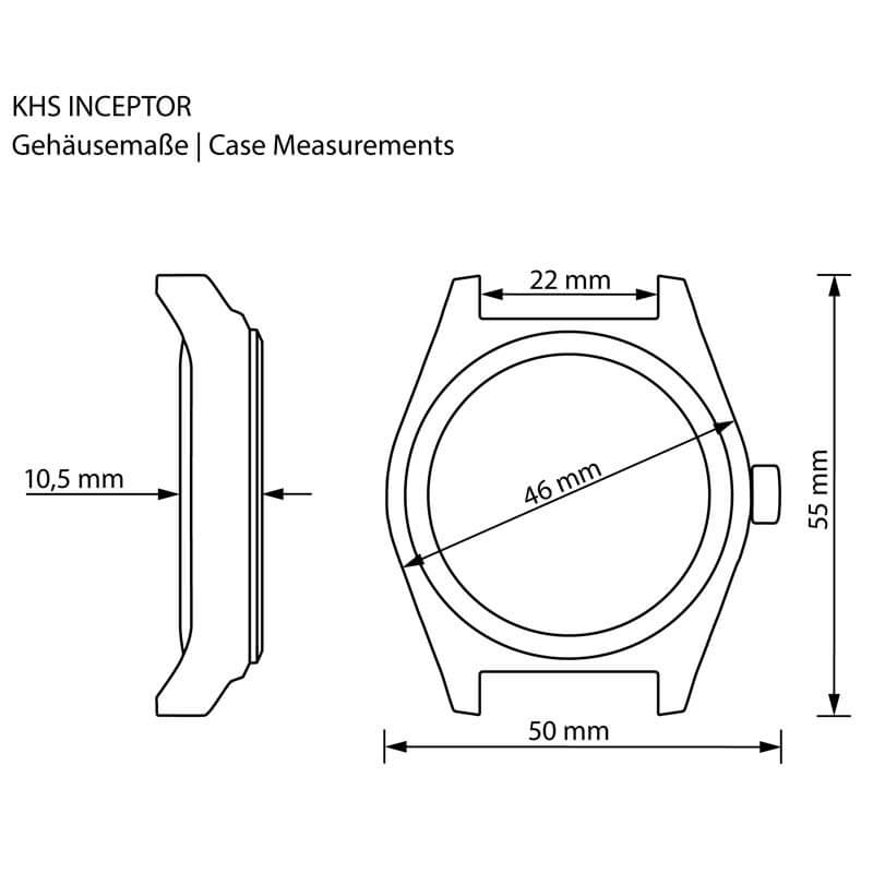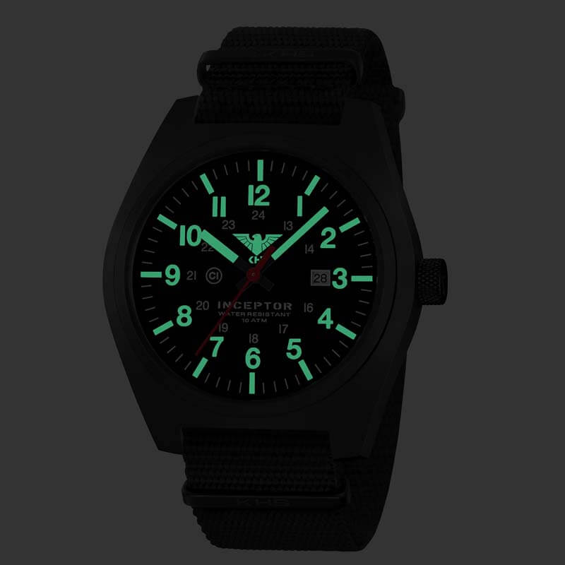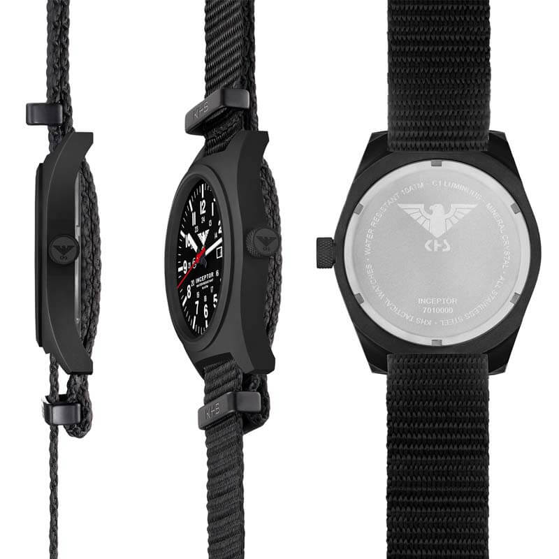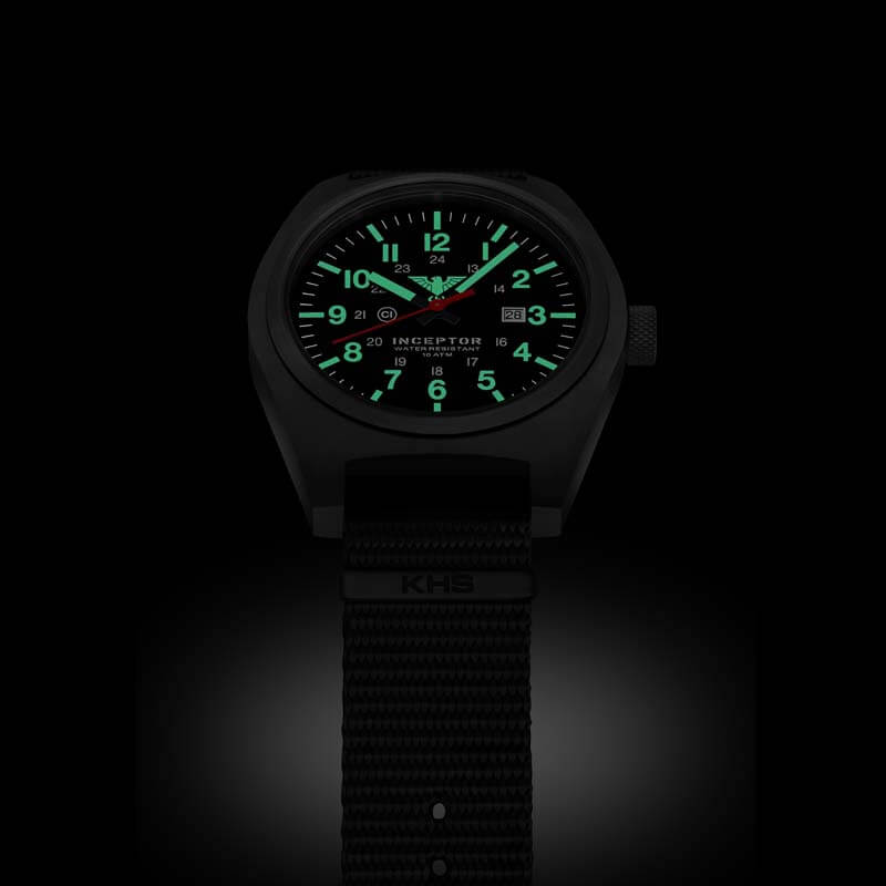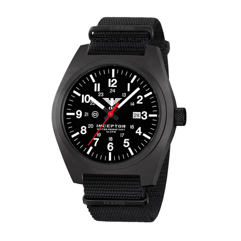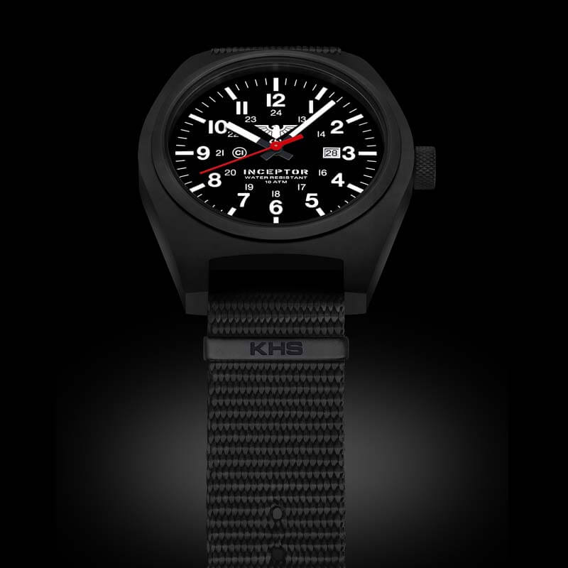 Die KHS Modellserie Inceptor lehnt sich an die bewährte U.S. Army Spezifikation MIL-W-46374F für Spezialeinheiten an, bekannt auch als “GI Basic Field Watch”, diese wird an die meisten US amerikanischen Soldaten als Teil der Ausrüstung ausgegeben. Die sehr leistungsstarke C1-Leuchtmasse illuminiert das Zifferblatt und die Zeiger zuverlässig in der Nacht und bei der neuen Inceptor wurde erstmals auch das KHS Adler-Logo auf dem Zifferblatt illuminiert. Die Black Steel besitzt ein massives Gehäuse aus Edelstahl mit einem verschraubten Gehäuseboden. Beides ist schwarz IP-beschichtet, ebenso die Krone, über welche die Funktionen der Einsatzuhr ganz einfach gesteuert werden können.