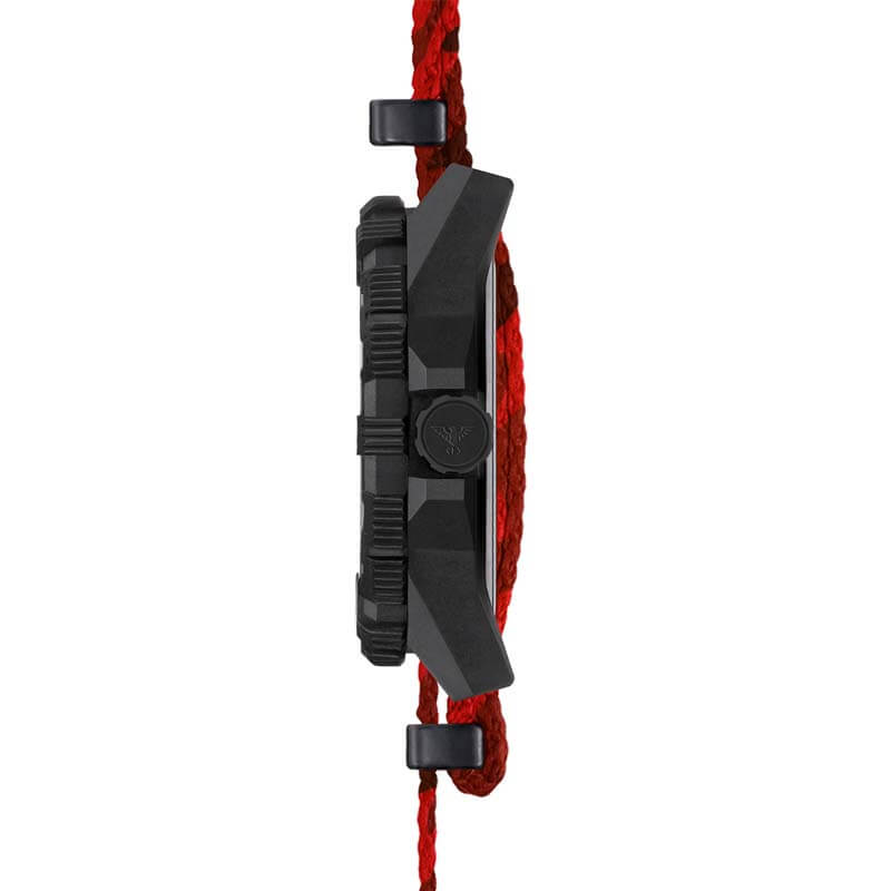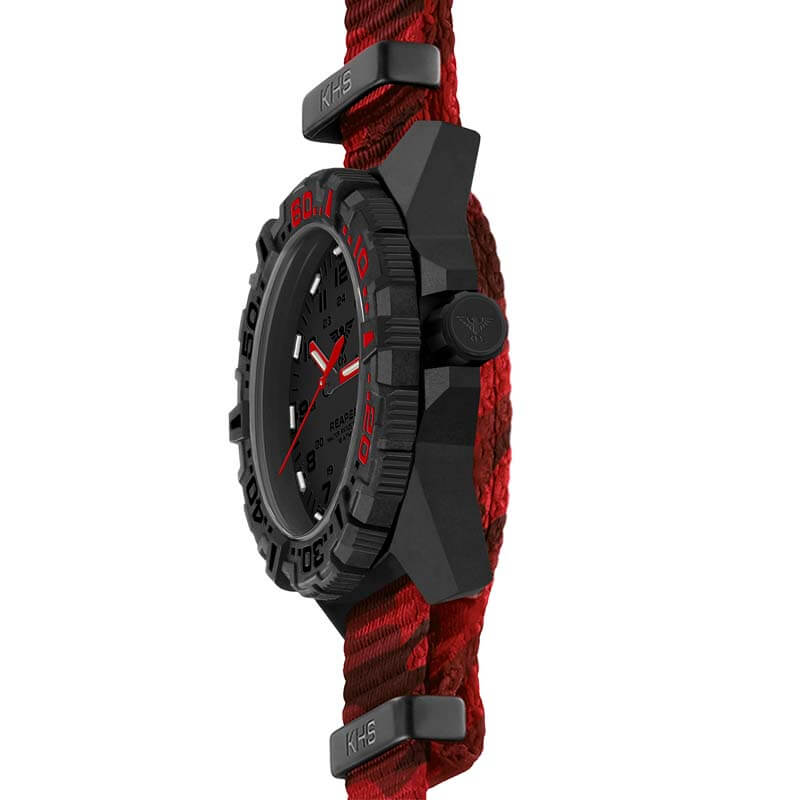 Die Reaper MKII RED – die nächste Evolutionsstufe der preisgünstigen Einsteigeruhren von KHS, jetzt deutlich verbessert, noch leichter und noch robuster! Erstmalig hergestellt unter Verwendung von NEOCARB, dem besten Karbonfaser-Polycarbonat-Komposit als Gehäusematerial. Ein weiteres Highlight ist die verbesserte Drehlünette, welche nun nicht nur durch ein spektakulär neues Design, sondern auch mit einer noch höheren Griffigkeit durch die Ergänzung seitlicher Griffrillen besticht.