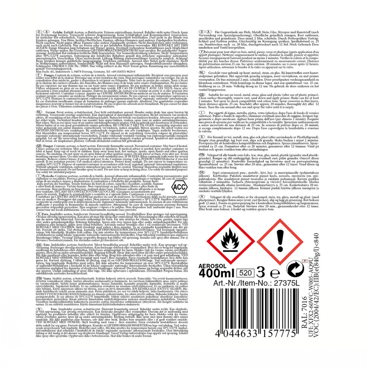 Gefahr: Extrem entzündbares Aerosol. Behälter steht unter Druck: Kann bei Erwärmung bersten. Darf nicht in die Hände von Kindern gelangen. Von Hitze, heißen Oberflächen, Funken, offenen Flammen oder anderen Zündquellen fernhalten. Nicht rauchen und nicht gegen Flamme oder andere offene Zündquelle sprühen. Nicht durchstechen oder verbrennen, auch nicht nach Gebrauch. Vor Sonnenbestrahlung schützen. Nicht Temperaturen über 50°C aussetzen. Inhalt / Behälter der Problemabfallentsorgung zuführen.