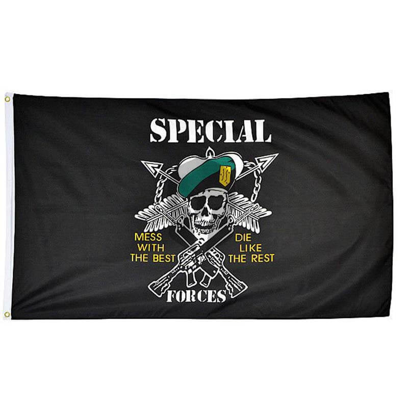 Mil-Tec Flagge Motiv Special Forces, der dienstältesten Spezialeinheit der US Army. Sie besteht aus reißfestem Polyester und ist mit Verstärkungsband und Ösen aus Metall versehen. Der hochwertige Siebdruck sorgt für brillante Farben und beste Wetterechtheit.
