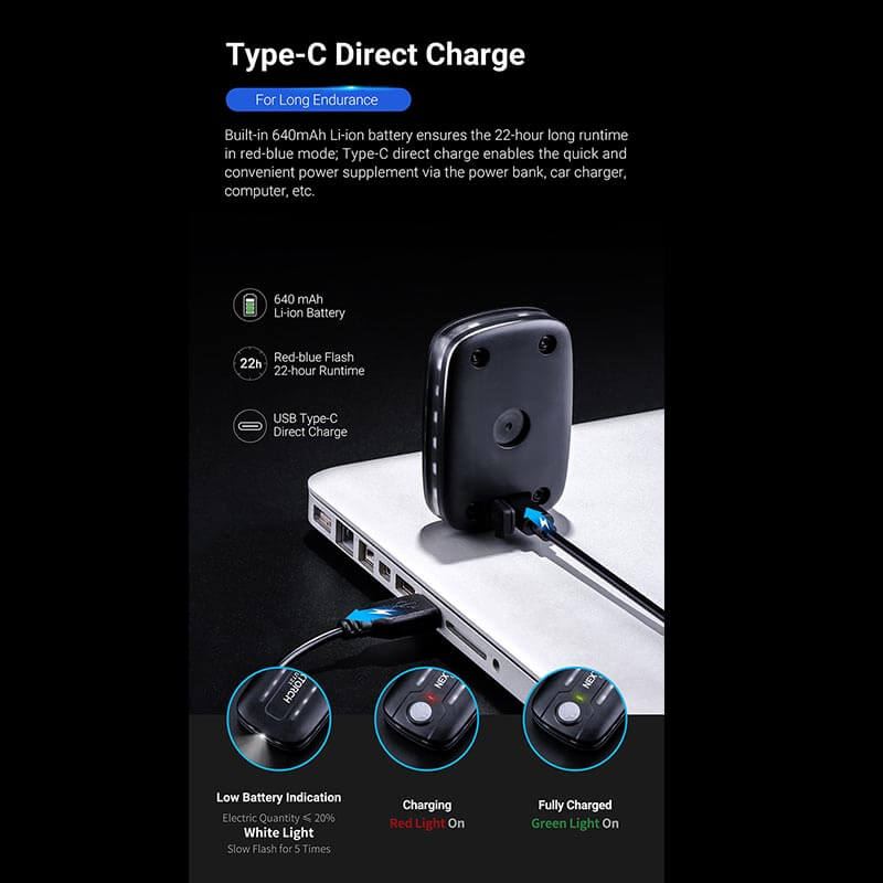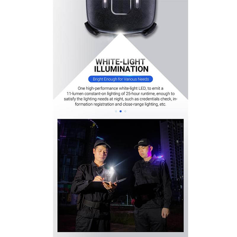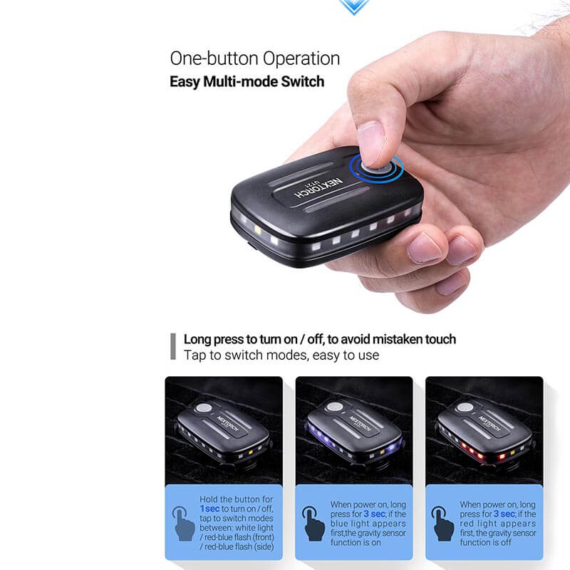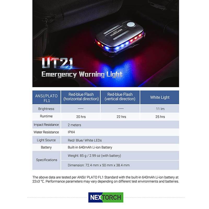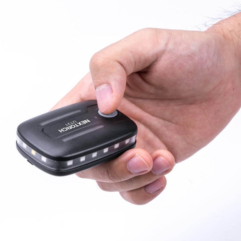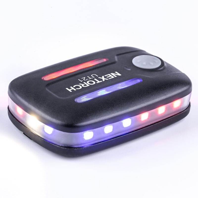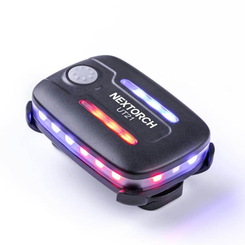 Die Nextorch UT21 blitzt ein weit sichtbares Warnlicht in Rot und Blau rundherum, wenn es z. Bsp. auf der Schulterklappe befestigt ist. Der Neigungssensor schaltet automatisch um, wenn die UT21 die Lage ändert – der Träger sich z. Bsp. bückt, hinlegt oder weit nach vorn beugt. Somit bleibt der Träger weiterhin deutlich sichtbar.