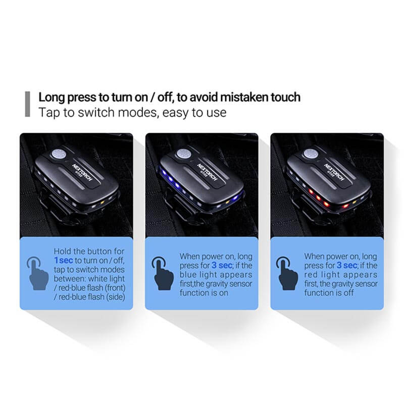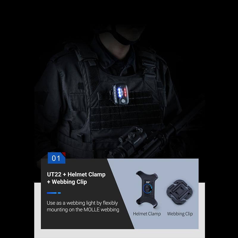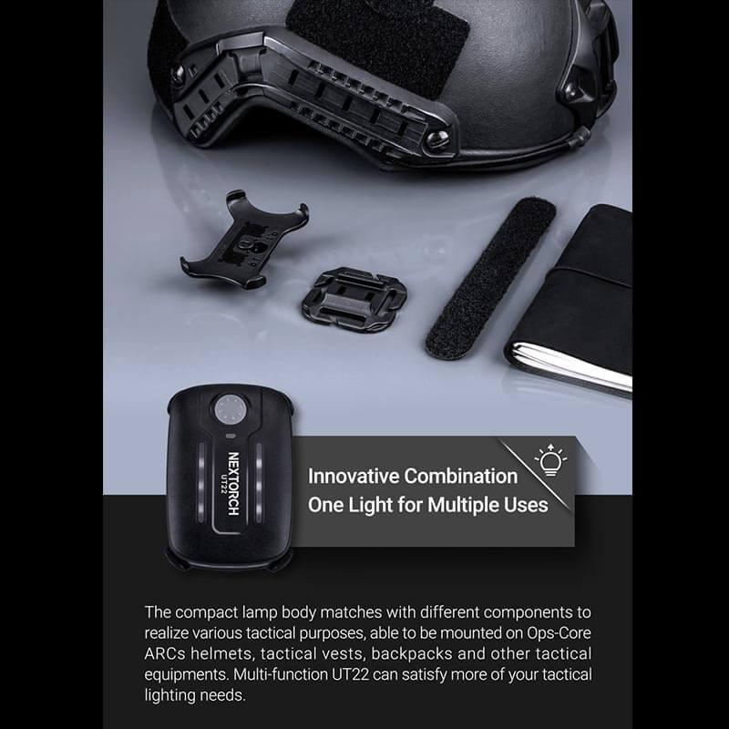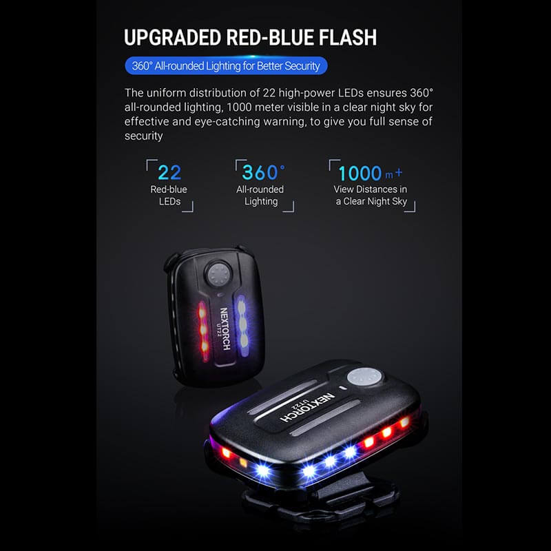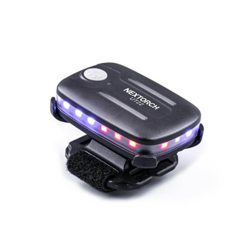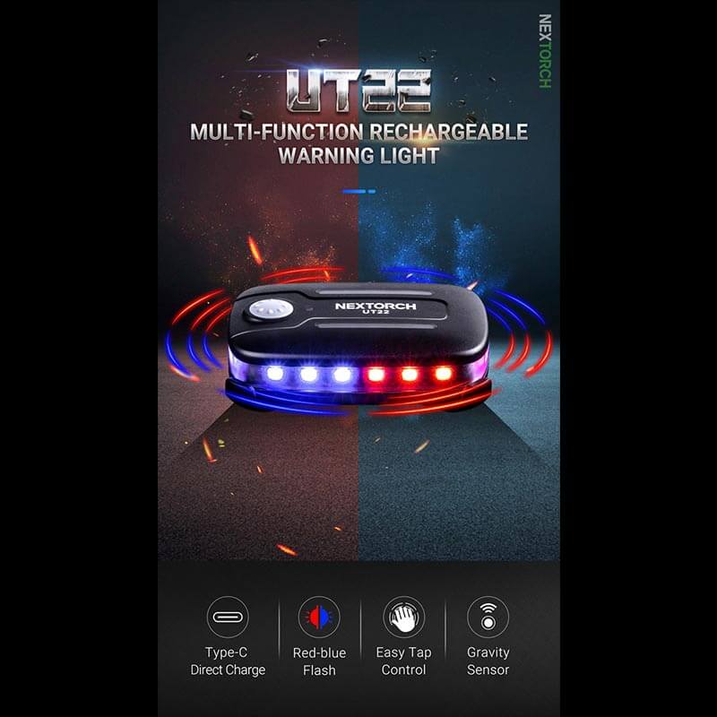 Die Nextorch UT22 blitzt ein weit sichtbares Warnlicht in Rot und Blau rundherum, wenn es z. Bsp. auf der Schulterklappe befestigt ist. Der Neigungssensor schaltet automatisch um, wenn die UT22 die Lage ändert – der Träger sich z. Bsp. bückt, hinlegt oder weit nach vorn beugt. Somit bleibt der Träger weiterhin deutlich sichtbar.