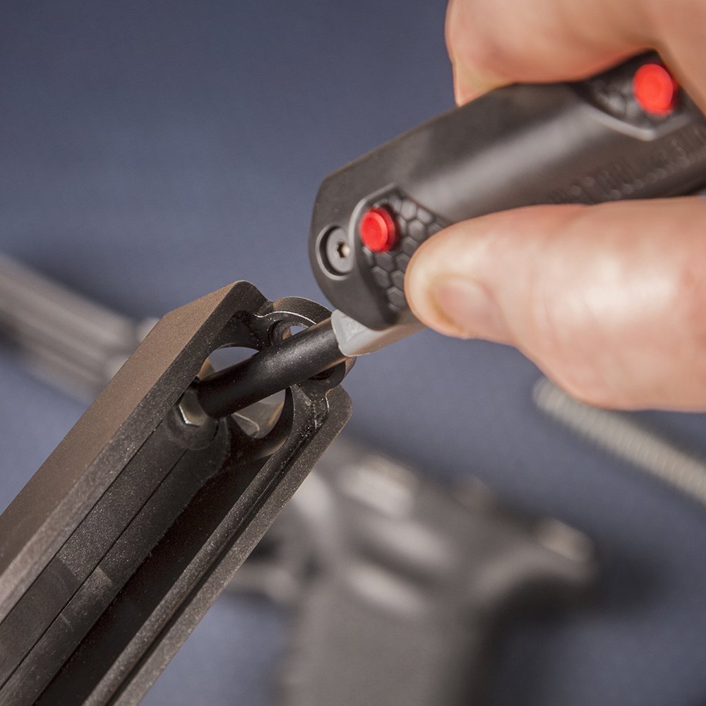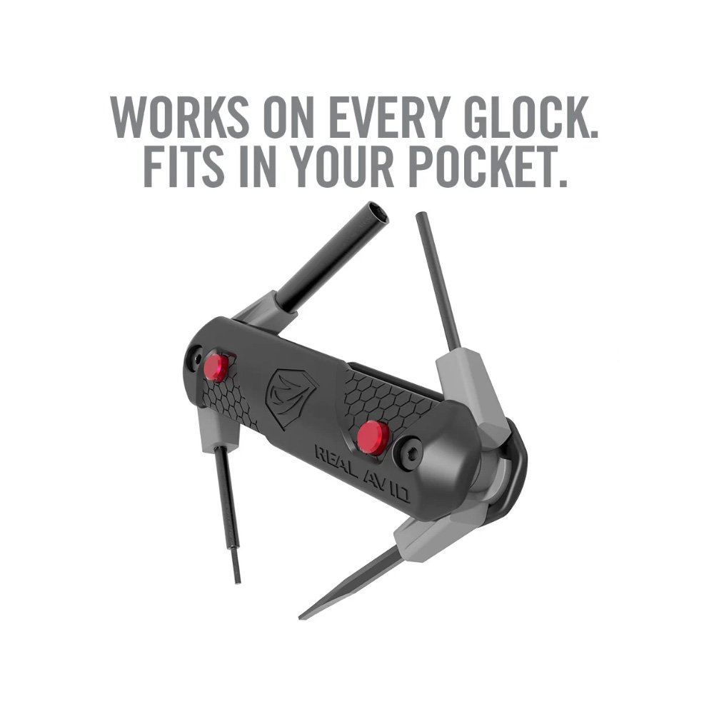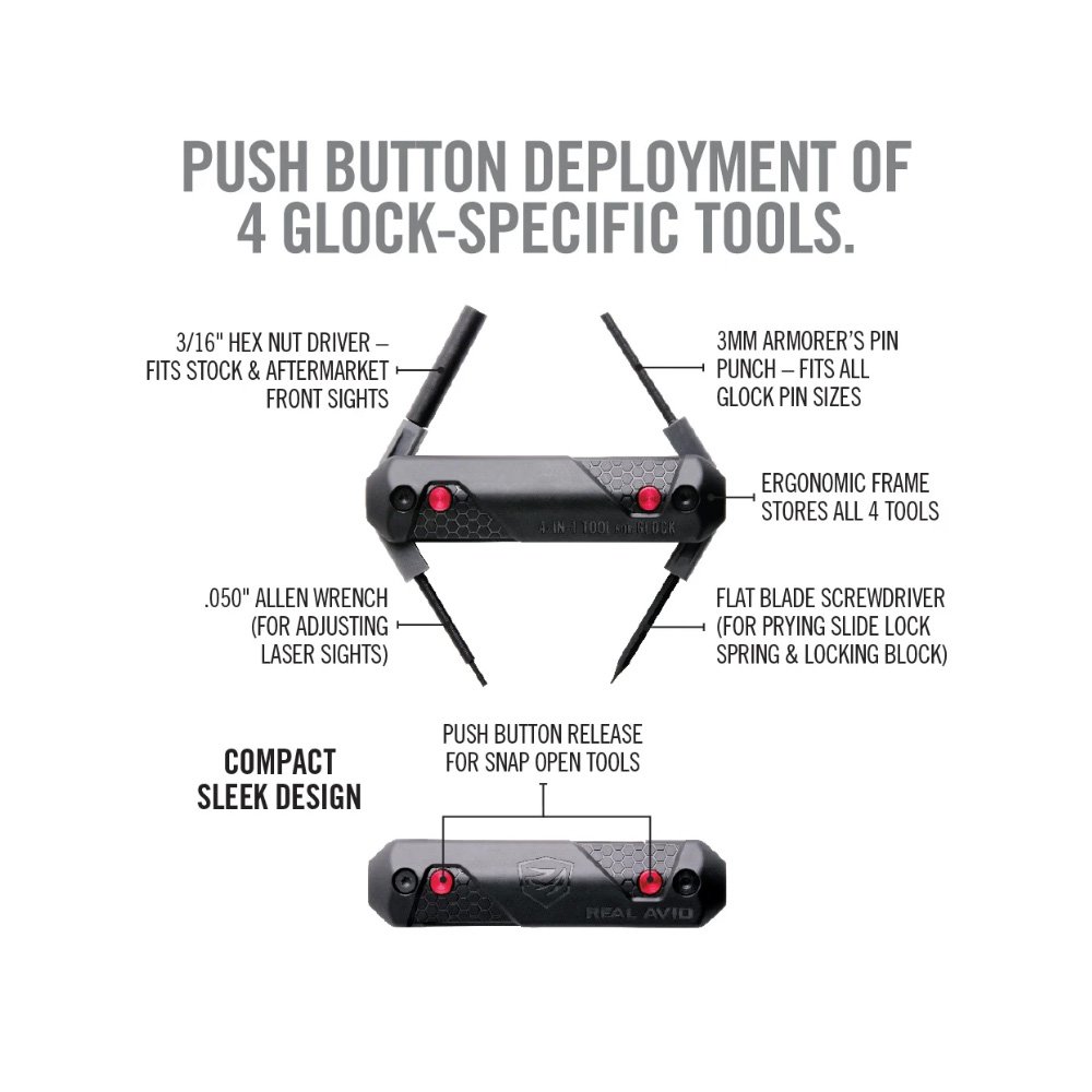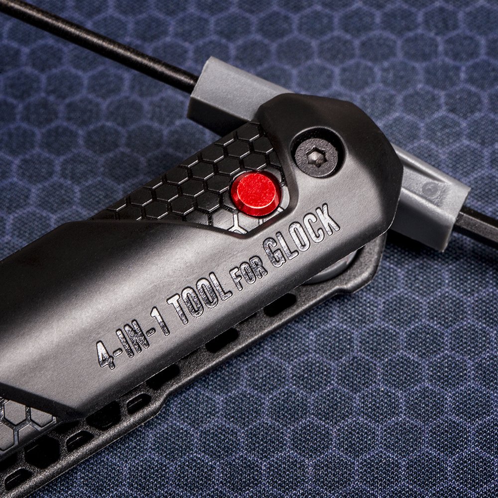 Schlank, ergonomisch, voller Funktionen und in jeder Hinsicht ein durch und durch modernes Waffenwerkzeug für deine GLOCK – das 4-in-1 Tool for GLOCK. Vier verschiedene und äußerst nützliche Werkzeuge befinden sich im Griff, der der Größe eines Taschenmessers ähnelt und jedes einzelne entrastet per Knopfdruck. Intelligent, präzise, fortschrittlich… genau wie deine GLOCK.