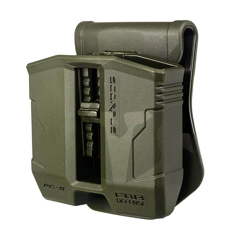Das Scorpus Doppel Magazinholster von FAB Defense ist eine robuste Doppel-Magazintasche für GLOCK-Magazine 9mm. Sie verfügt über ein um 35° verstellbares Paddle sowie eine einzigartige 8-fach verstellbare Magazinkontrolle für optimale persönliche Kompatibilität. Dieses innovative System wurde speziell für schnelles Ziehen und sicheres Tragen entwickelt. Durch das besonders schlanke und kompakte Design ist sie perfekt für einen sicheren Transport der Magazine geeignet und bietet darüber hinaus auch noch einen hervorragenden Magazinschutz.