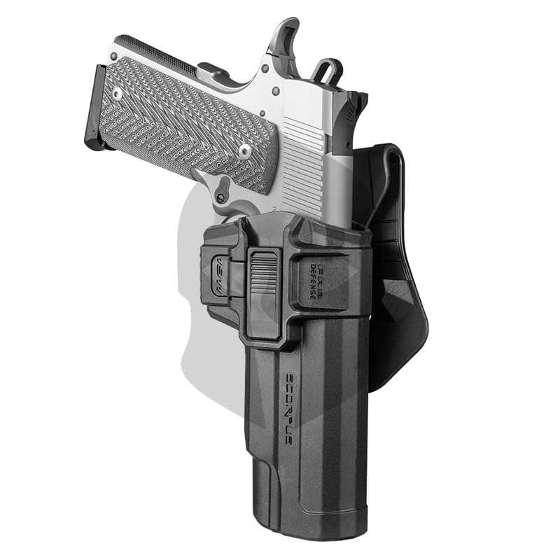 Das FAB Defense Scorpus M1 Level 2 Retention Holster 1911 ist ein innovatives Holster für 1911 Modelle mit austauschbaren Gurtadaptern und einer Neigungswinkeleinstellung von 20°. Es verfügt über ein einzigartiges “Dual Rast” Haltesystem, welches in den Abzugsbügel der Pistole greift und dadurch sicheren Halt bietet. Außerdem verfügt es über eine Ein-Finger-Sicherung, welche erst betätigt werden muss, um die Waffe ziehen zu können. Dieses kombinierte System stellt sicher, dass selbst dann, wenn der Verriegelungsmechanismus deaktiviert wird, die Waffe immer noch durch die federbasierte Haltevorrichtung gehalten wird. Um die Pistole zu ziehen, muss der Schütze den Griff der Waffe festhalten, auf den druckbetätigten Sperrhebel drücken und danach einen sauberen Zug ausführen.