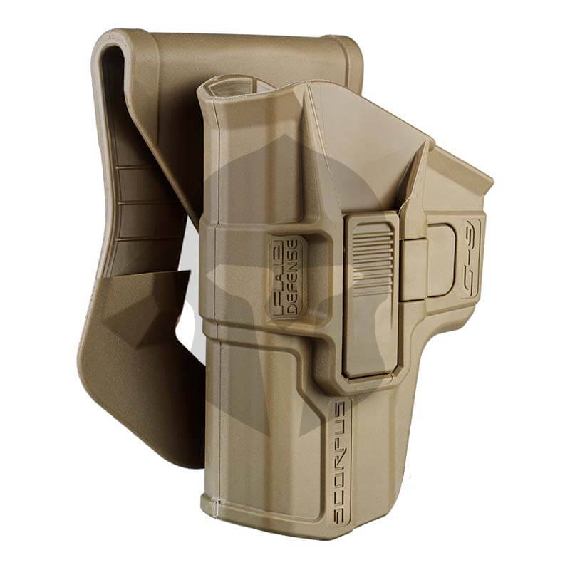 Das FAB Defense Scorpus M1 Level 2 Retention Holster ist ein innovatives Holster für viele GLOCK Modelle mit austauschbaren Gurtadaptern und einer Neigungswinkeleinstellung von 20°. Es verfügt über ein einzigartiges “Dual Rast” Haltesystem, welches in den Abzugsbügel der Pistole greift und dadurch sicheren Halt bietet. Außerdem verfügt es über eine Ein-Finger-Sicherung, welche erst betätigt werden muss, um die Waffe ziehen zu können. Dieses kombinierte System stellt sicher, dass selbst dann, wenn der Verriegelungsmechanismus deaktiviert wird, die Waffe immer noch durch die federbasierte Haltevorrichtung gehalten wird. Um die Pistole zu ziehen, muss der Schütze den Griff der Waffe festhalten, auf den druckbetätigten Sperrhebel drücken und danach einen sauberen Zug ausführen.