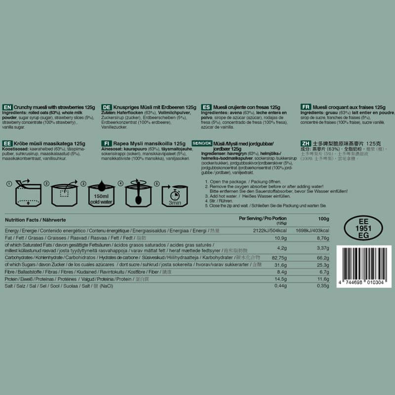 Tactical Foodpack Crunchy Muesli with Strawberries – Designed by Special Forces! Das knusprige und natürliche Müsli riecht verrückt lecker und ist garantiert mit gefriergetrockneten Erdbeeren versehen, die das Aussehen und den Geschmack perfekt abrunden. Das Müsli mit 150 ml kaltem Wasser anrühren und 3 min ziehen lassen. Energiegehalt 2.122 kJ/504 kcal pro Portion.