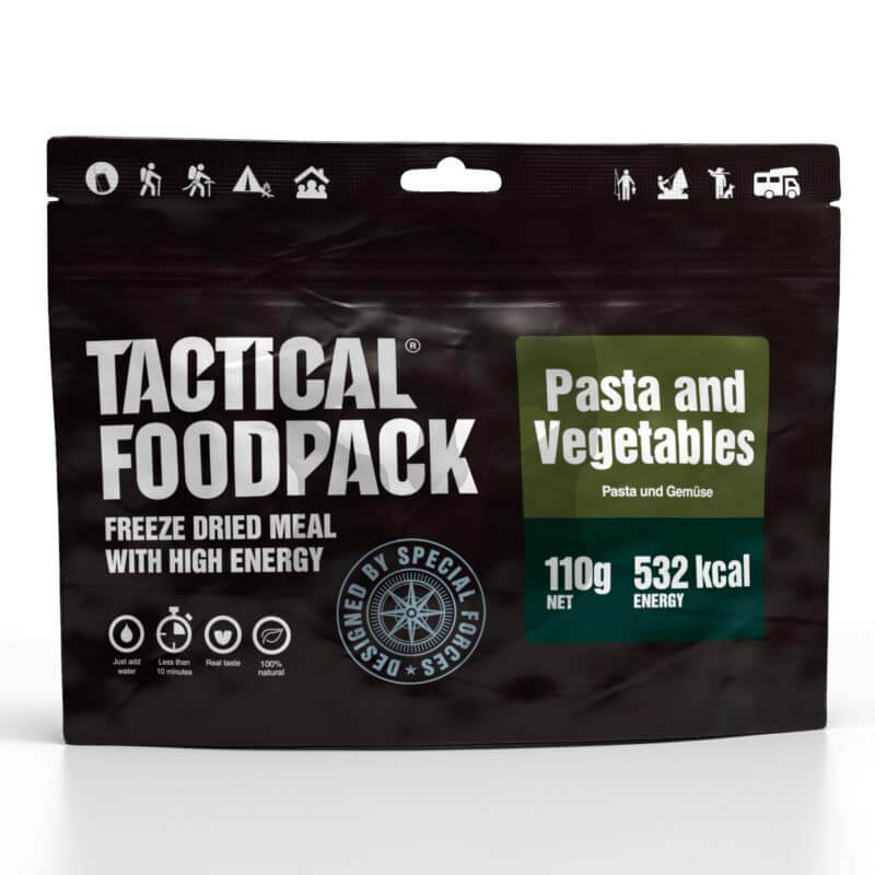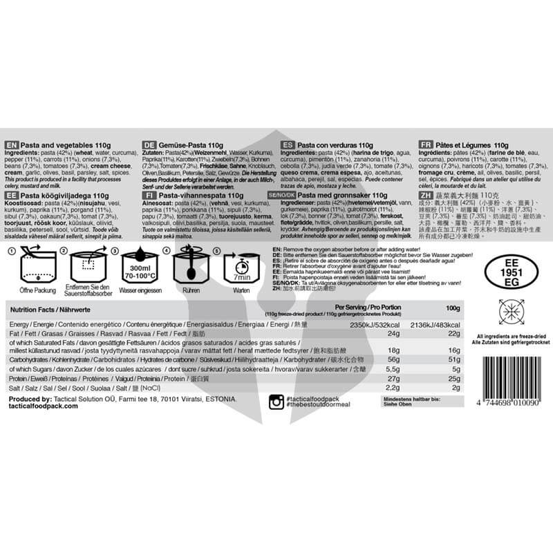 Tactical Foodpack Pasta and Vegetables – Designed by Special Forces! Eine köstliche Pasta mit leckerem und gesunden Gemüse, die eine gute Abwechslung zu Fleischgerichten bietet. Das Produkt ist mit heißem Wasser in 7 min und mit kaltem Wasser in 14 min fertig. Energiegehalt 2.146 kJ/513 kcal pro Portion.