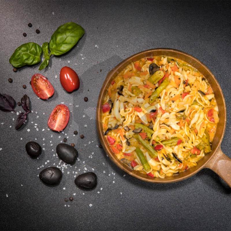 - Pasta (42%) (Weizenmehl, Wasser, Kurkuma), Paprika (11%), Karotten (11%), Zwiebeln (7,3%), Bohnen (7,3%), Tomaten (7,3%), Frischkäse, Sahne, Knoblauch, Oliven, Basilikum, Petersilie, Salz, Gewürze. Die Herstellung dieses Produktes erfolgt in einer Anlage, in der auch Milch, Senf und Sellerie verarbeitet werden.