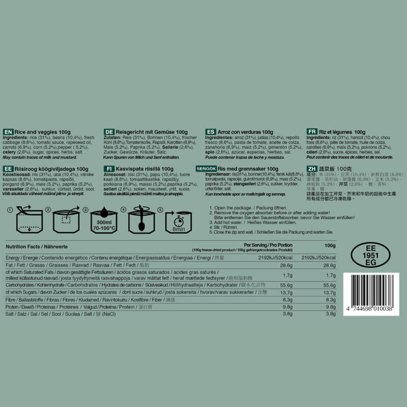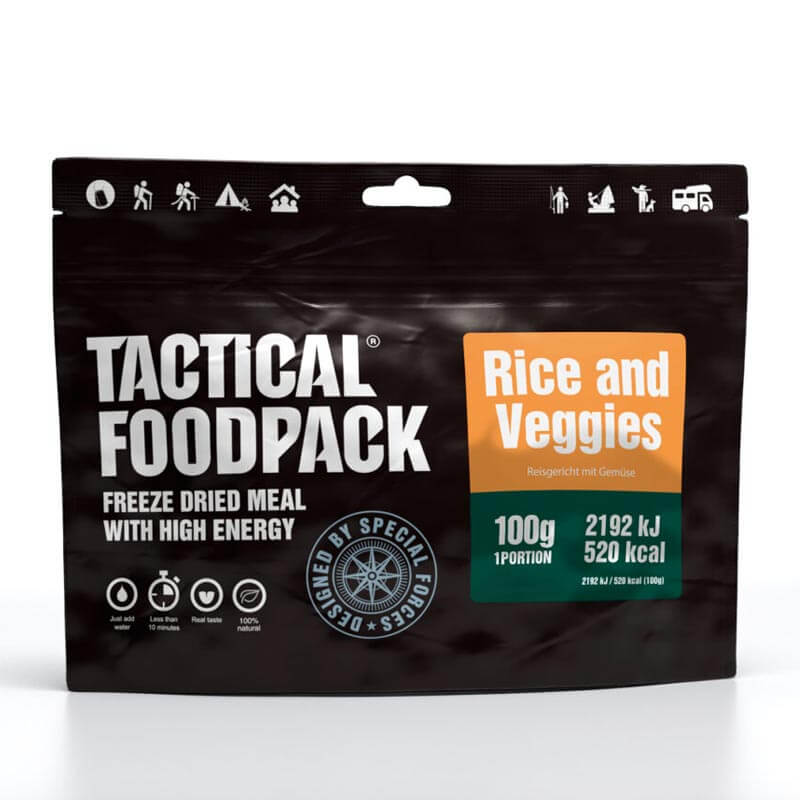 Reisgericht mit Gemüse – Designed by Special Forces! Rice and Veggies ist eine hervorragende vegane Speise mit Reis und reichlich gewoktem Gemüse. Frischer Kohl verleiht der Speise Frische und Bohnen wiederum Fülle, so ist die Speise mit 520 kcal kalorienreich und son manchem Fleischgericht überlegen. Für Veganer als auch Fleischfreunde geeignet. Das Produkt ist mit heißem Wasser in 8 min und mit kaltem Wasser in 16 min fertig. Energiegehalt 2.192 kJ/520 kcal pro Portion.