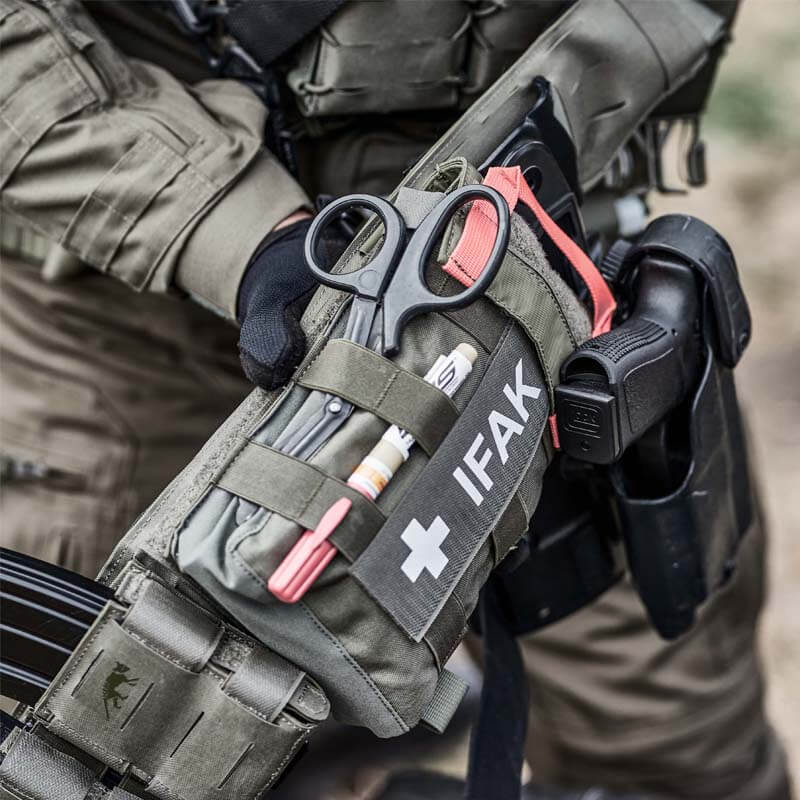 Tasmanian Tiger hat wieder einmal ein neues Highlight auf den Markt gebracht – die IFAK Pouch VL L IRR. Natürlich ist auch sie mit dem TT typischen Schnellzugriff-System ausgestattet, aber das Besondere an dieser Erste-Hilfe-Tasche ist, dass sie mit einer Molle-Plattform zum Abreißen ausgestattet ist. Das heißt, die Molle-Plattform ist auf die Pouch aufgeklettet, wodurch die Tasche im Notfall mit nur einem Handgriff vom Gear getrennt werden kann. Die Pouch selbst ist mit elastischen Molle-Schlaufen auf der Front sowie einem fix vernähten roten Ziehgriff ausgestattet und der umlaufende Rand ist aus einem Stretch-Material gefertigt. Somit lässt sich die Tasche bis auf 6 cm dehnen und man hat jede Menge Platz für notwendiges Verbandsmaterial und Zubehör. Das im Inneren der Tasche befindliche Medic-Panel ist mit einem Klarsicht- und Einschubfach sowie zahlreichen elastischen Schlaufen ausgestattet, um sämtliches Erste-Hilfe-Material gut strukturiert verstauen zu können. Im Lieferumfang der IFAK Pouch VL L enthalten ist ein Klettadapter. Dieser kann z. Bsp. in das Plattenfach eines Plate Carriers eingeklettet werden um die IFAK bei Bedarf schnell hin und her wechseln zu können.
