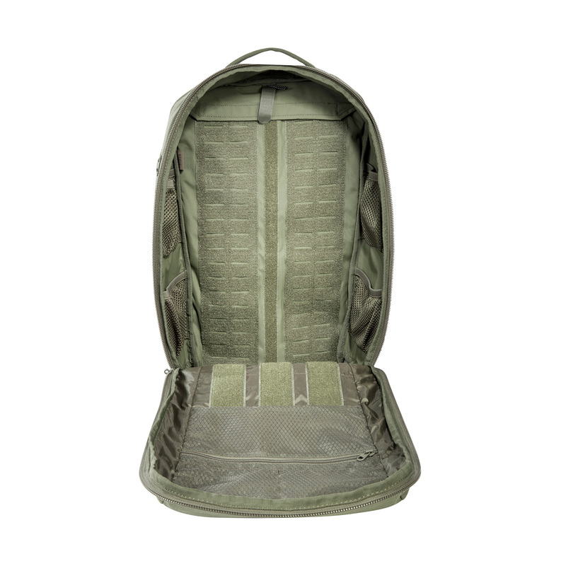 Der Daypack ist mit einem umlaufenden Reißverschluss ausgestattet, der dir uneingeschränkten Zugriff auf das gesamte 28 Liter fassende Hauptfach ermöglicht. Organisationsmöglichkeiten im Inneren bieten dir die vier seitlichen kleinen Netztaschen und die Molle-Klettflächen an der Innenwand des Rucksackes. Für schnell erreichbare Dokumente oder Kleinteile gibt es eine flache Reißverschluss-Tasche auf der Front und dank der zwei umlaufenden Kompressionsriemen lässt er sich bei Bedarf optimal komprimieren.
