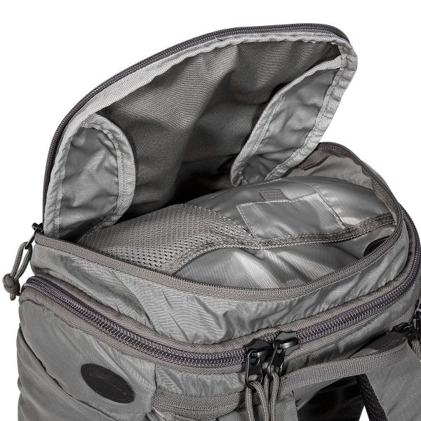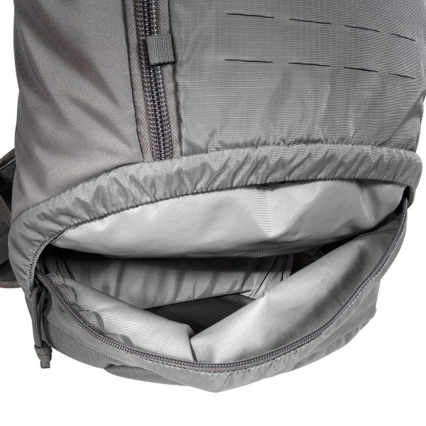 Optisch ist der Rucksack recht unauffällig gestaltet – nur zwei Reihen dezenter Lasercut und nicht wie üblich D-Ringe aus Polymer, sondern Schlaufen aus einem extrem reißfesten gummierten Material. Auf dem Deckel gibt`s Bungee Cord und im Deckel das bewährte Organizer-Fach mit D-Ringen, Mesh- und Einschubtasche sowie einer geschlossenen Tasche. Auch die zwei Seitentaschen sehen ziemlich unscheinbar aus, lassen aber problemlos selbst große Trinkflaschen darin verschwinden. Im unteren Bereich des Vent`s befindet sich ein separates Fach, das z. Bsp. für einen nicht zu großen Schlafsack genutzt werden kann. Außerdem hat man die Möglichkeit, den Unterteiler aufzuzippen, um so das ganze Volumen des Rucksackes zu nutzen.