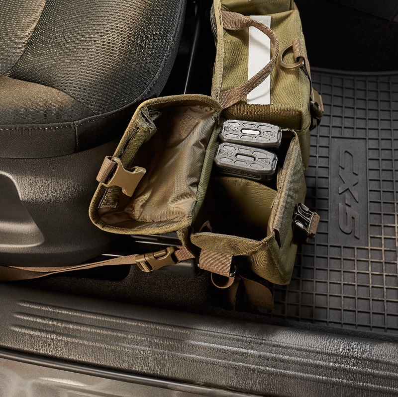 Der Tasmanian Tiger TacVec Container bietet als Teil der TacVec-Serie den Stauraum für das allerletzte Kleinzeugs, was im Auto so rumliegt. Konzipiert wurde diese Taschenvariante speziell für Fahrzeuge und dort wiederum zur Befestigung unter bzw. am Vordersitz und zwar mittels eines sehr langen 25 mm Gurtbandes und Steckschließen. Der Container selbst ist eine längliche Tasche mit drei ausgepolsterten und ausgesteiften Fächern. Jede einzelne Tasche ist ca. 12 cm breit und wird mittels Klett und/oder Fastex-Schnallen verschlossen. Ein weiteres flaches und mit Reißverschluss verschließbares Fach an der Rückseite dient zur Aufbewahrung von Papieren oder Dokumenten. Zur weiteren Ausstattung gehören noch ein längenverstellbarer Schultertragegurt, drei robuste Tragegriffe, Molle-Klett an der Rückseite der Tasche sowie Klettflächen für farblich markierte und beschriftbare Klettstreifen.