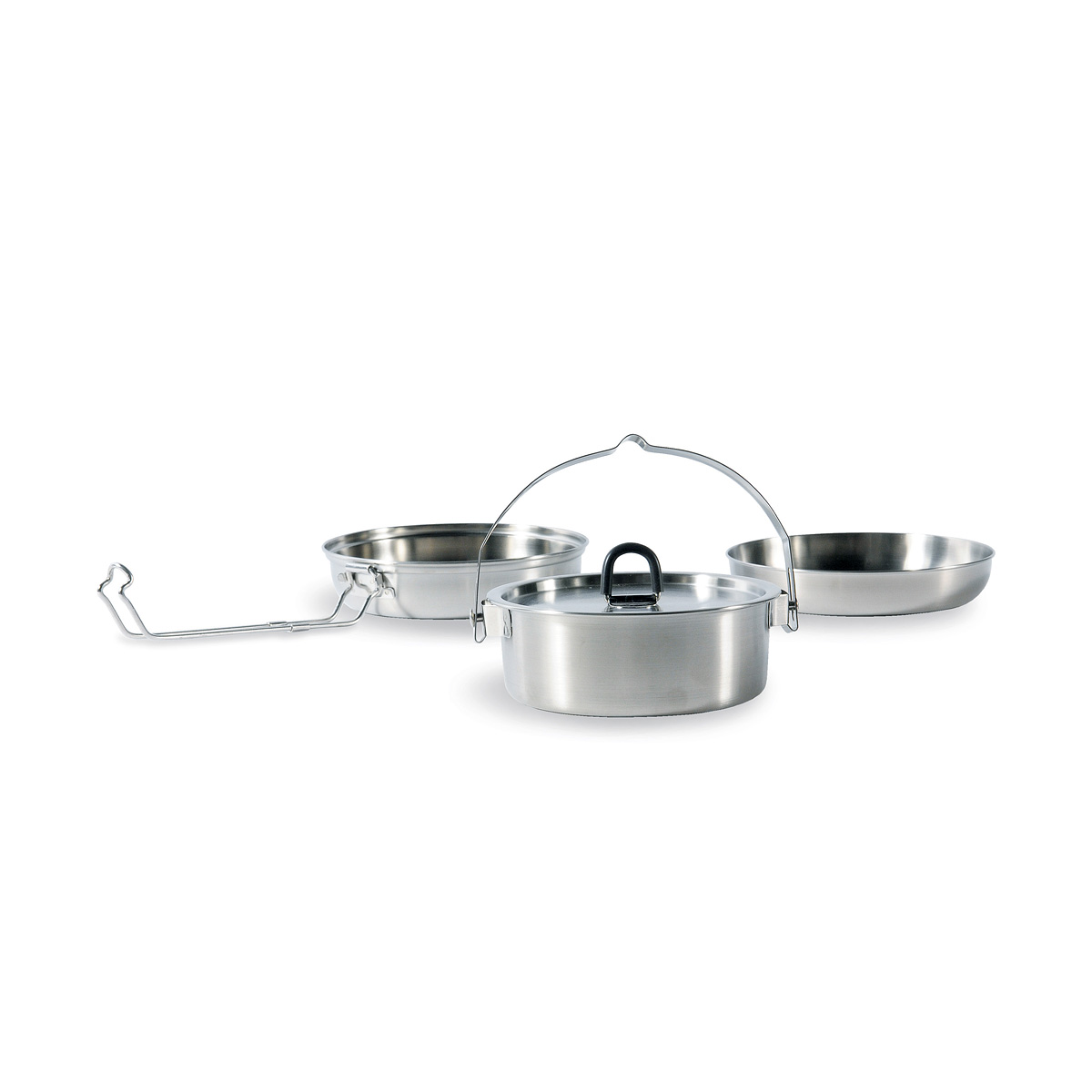 Robust, langlebig und einfach zu reinigen – das Tatonka Camping Kochset aus Edelstahl. Dank Matroschka-Prinzip ist es perfekt für den Outdoor-Bereich zugeschnitten. Das Set ist für eine Person geeignet, aus rostfreiem Edelstahl gefertigt und besteht aus Topf mit Henkel und Deckel, Pfanne sowie Schale. Natürlich kann das Kochset auf allen handelsüblichen Kochern eingesetzt werden. Außerdem besitzt der Kochtopf eine Skalierung im Inneren und der Griff der Pfanne ist klappbar. Alle drei Teile ineinander gestellt ermöglicht es so einen Transport auf minimalem Raum. Also los – das Tatonka Camping Kochset eingepackt und los geht`s nach draußen!