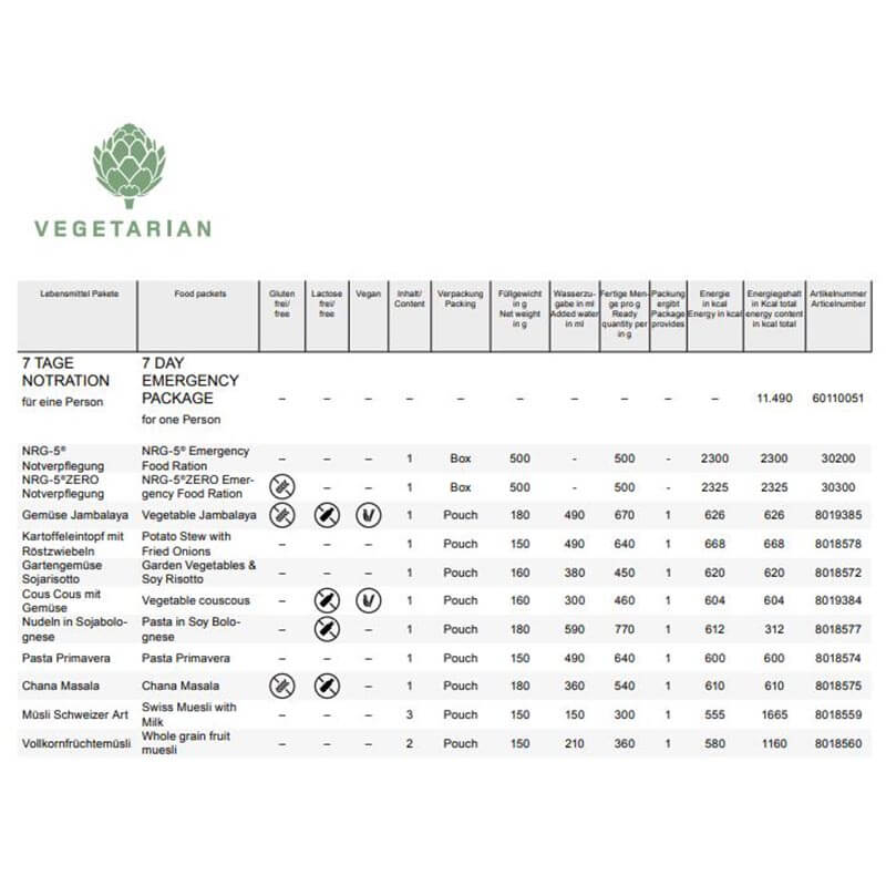 Jetzt auch vegetarisch! Trek`n Eat bietet mit diesem 7 Tage Notration-Paket Lebensmittel für eine Person für 7 Tage. Das Emergency Food ist perfekt für alle, die auf Tour auch kulinarisch optimal gerüstet sein wollen. Es beinhaltet eine ideale Kombination von 12 unterschiedlichen Menü`s, die nur durch Zufügen von kochendem Wasser allesamt schnell zubereitet sind, einen hohen Anteil des Grundbedarfs an Nährstoffen decken und vor allem auch schmecken. Alle Gerichte sind unter Schutzatmosphäre verpackt und orientieren sich an einem Wert von ca. 600 kcal pro Packung.