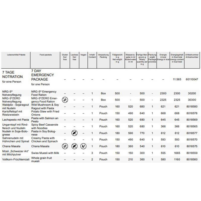 Trek`n Eat bietet mit diesem 7 Tage Notration-Paket Lebensmittel für eine Person für 7 Tage. Das Emergency Food ist perfekt für alle, die auf Tour auch kulinarisch optimal gerüstet sein wollen. Es beinhaltet eine ideale Kombination von 12 unterschiedlichen Menü`s, die nur durch Zufügen von kochendem Wasser allesamt schnell zubereitet sind, einen hohen Anteil des Grundbedarfs an Nährstoffen decken und vor allem auch schmecken. Alle Gerichte sind unter Schutzatmosphäre verpackt und orientieren sich an einem Wert von ca. 600 kcal pro Packung.