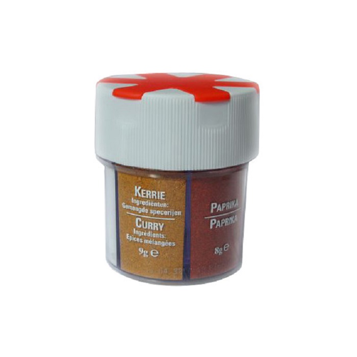 - 6 Fächer gefüllt mit je 35 g Tafelsalz, 8 g Paprika edelsüß, 8 g Curry (Koriander, Bockshornklee, Kurkuma, Salz, Knoblauch, Chili, Cumin, Ingwer), 8 g Knoblauch-Granulat, 7 g Pfeffer weiß gemahlen, 6 g Pfeffer schwarz gemahlen