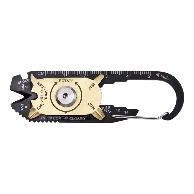 Mit dem Fixr präsentiert True ein patentiertes Karabinerwerkzeug, welches sich unkompliziert an Tasche oder Schlüsselbund befestigen lässt. Hinter dem Fixr verbergen sich die wichtigsten Werkzeuge, welche deinen Alltag erleichtern werden. Eine bemerkenswerte Auswahl an Werkzeugen wie ein Schraubendreher, ein Nagelheber, eine Feile, ein Flaschenöffner und sogar ein versteckter Schneider und eine Abisolierzange sind Bestandteile dieses 20 in 1 Tools. Hergestellt aus schwarz titanbeschichtetem 420 Edelstahl und mit einer Gold titanbeschichteten Edelstahlscheibe, die sich auf einem Edelstahlkugellager dreht, lassen sich mit diesem Tool einige Aufgaben problemlos bewältigen. Ein schwarzes Lederetui rundet die Ausstattung ab.
